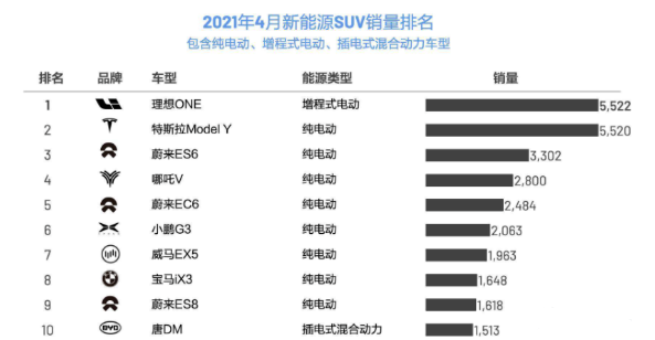 根据中汽数据终端零售数据,2021年4月理想ONE终端销量为5522台,以细微优势再次超越特斯拉Model Y的5520台成为中国新能源SUV销量第一名。