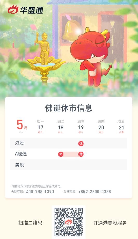 华盛资讯5月17日消息,港股5月19日(周三)因佛诞节休市一天,北向交易明日起关闭2天,南向交易5月19日(周三)关闭一天。具体如下: