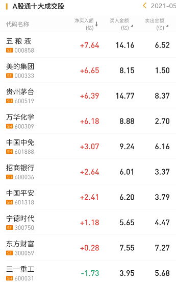 北上资金今日净买入五粮液7.64亿元,为今日买入之最。此外,北上资金净买入美的集团6.65亿港元,净买入贵州茅台6.39亿港元。