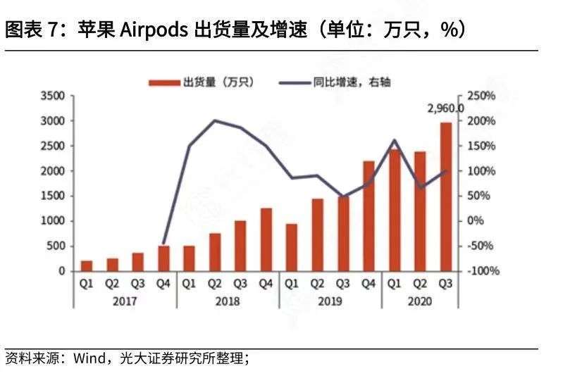 与此同时,AirPods销售成为苹果重要收入来源,2020年苹果营业收入2745.15亿美元(约合人民币1.76万亿元),其中AirPods贡献了230.5亿美元(约合人民币1480亿元)占公司总收入的8.3%。