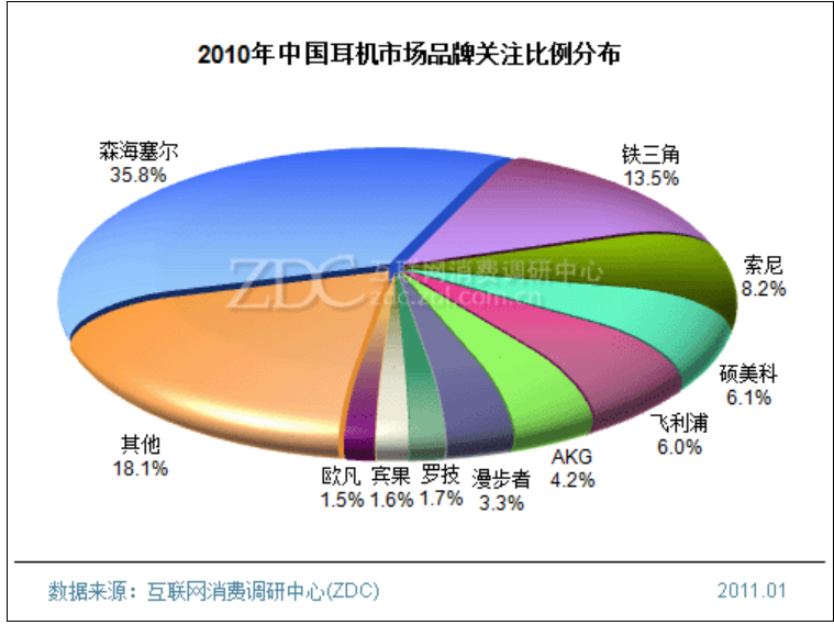 然而,和2010年凭借35.8%的关注度一骑绝尘相比,森海塞尔的优势在随后几年里逐渐削弱,与索尼、铁三角等主要竞争对手几近平分秋色。根据ZDC的调查数据显示,直到2018年第三季度,森海塞尔仍占据中国耳机市场最受关注品牌的榜首位置,但11.88%的比例和第二名索尼的差距只有0.15个百分点。而在2018年全年的关注度上,索尼成功实现了反超。