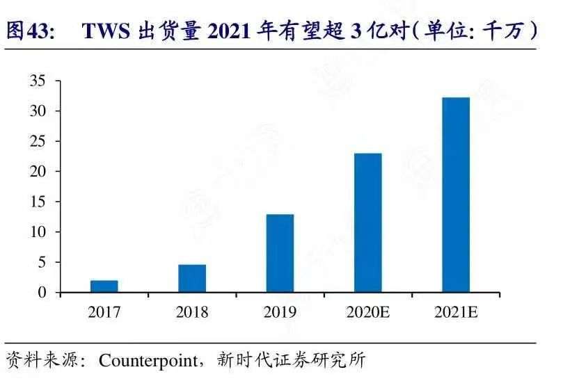 数据显示,2016年,全球TWS出货量仅为918万台,2020年便达到2.33亿台。Counterpoint预测,2021 年全球 TWS 耳机市场规模将达 3.1 亿台,同比增长 33%。