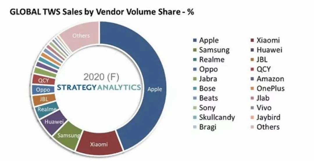 值得注意的是,在市场研究机构Strategy Analytics发布的2020年全球TWS耳机市场数据中,销量排名前五的全是手机厂商。