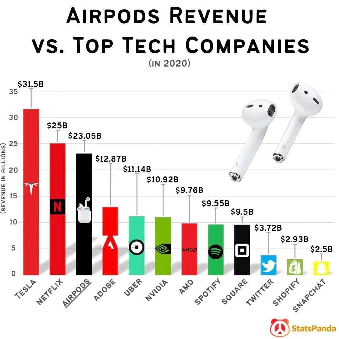 如果AirPods是一家独立公司,其在2020年的营收可以与Nvidia、Spotify、Twitter这三家公司加在一起的营收总和打个平手,其商业价值可见一斑。