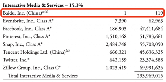 根据ARK的年报披露,其在2020年上半年已经持有部分百度股票(由ARKQ和ARKW两支基金持有),百度被其归入互动媒体和服务板块。