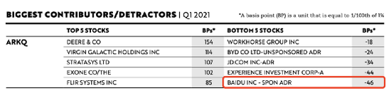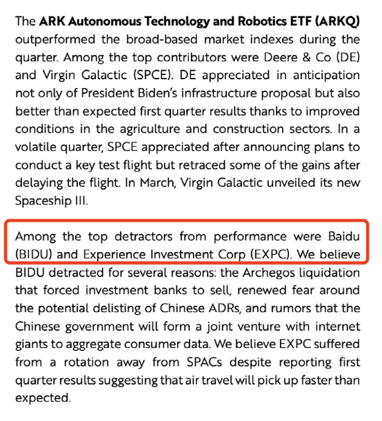 ARK在一季度财报中直言,百度是影响ARKQ一季度业绩表现的最大因素之一,而ARK对百度股价不断下跌的分析是Archegos(前段时间引发市场热议的对冲基金经理Bill Hwang爆仓事件)清算迫使投行抛售,引发市场恐慌;中概股退市风波,以及政府相关动作。