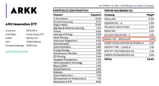 自此,ARK旗下三大基金ARKK、ARKQ及ARKW均拥有百度仓位。