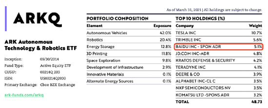 在ARK三支旗舰ETF中,百度是ARKQ Autonomous Tech and Robo 自动化基金的第8大持仓,也是ARKK Disruptive Innovation 颠覆式创新基金前15大持仓中唯一中概股。