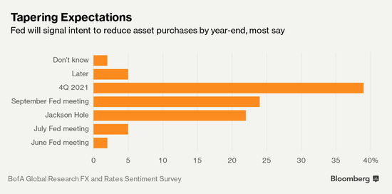 对美国国债的看跌立场,也反映在关于美联储何时可能暗示放缓购债速度的调查中。过半数受访者预计美联储不会晚于9月政策会议这样做。