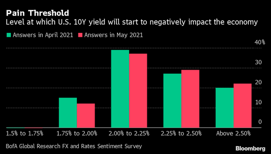 与之相一致的是,美国银行调查还发现美债收益率“痛苦门槛”不断上升,51%的受访者表示经济可承受10年期国债收益率升至2.25%,高于4月调查得到的47%。