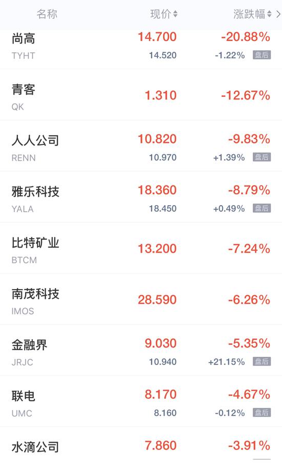 人人公司跌近10%,比特矿业跌超7%,水滴公司跌近4%,唯品会、名创优品跌超3%,爱奇艺、知乎、金山云跌超1%。