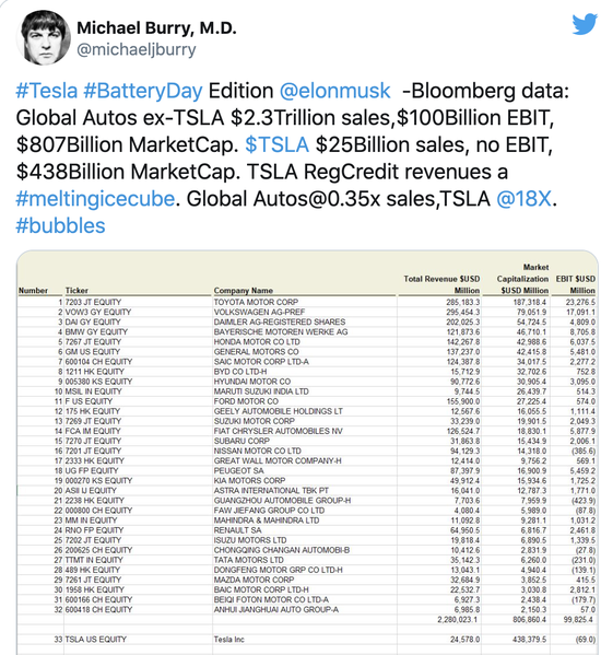 Burry对特斯拉看空其实由来已久。早在去年9月21日,Burry就指出,特斯拉的估值与行业内其他公司相比过于荒唐。他当时在推特上贴出一张截图并指出,特斯拉的市销率达到18,而行业平均为0.35。