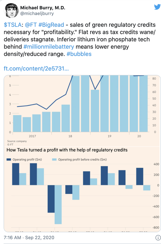 在此之前,Burry曾经在推特上表示,特斯拉依靠监管积分来创造盈利是对公司长期前景的阻碍,不过相关推文随后被删除。