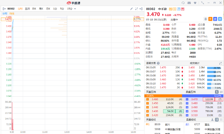 5月18日消息,中手游涨6.77%,报3.47港元,最新市值96亿港元。