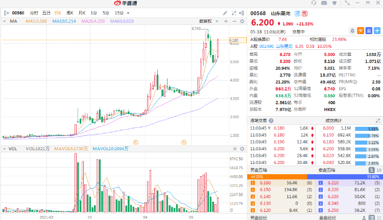 近期山东墨龙AH股均强势拉升,H股今日再度大涨逾20%,报6.20港元;A股已经封涨停板,报6.35元冲击阶段新高价。H股今年以来走势靓丽,最大涨幅已经高达630%,股价翻逾8倍创2008年4月以来新高价;A股今年迄今亦涨超90%创逾3年新高。