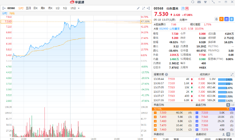 5月18日消息,山东墨龙成为今天港股最靓的仔,股价直接暴涨50%,百万大单频繁买入,资方背景曝光,竟是钢铁概念股,发生了什么?