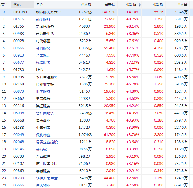 5月18日消息,港股物业管理股午后继续拉升,融创服务、新城悦服务、建业新生活涨8%,金科服务、时代邻里、合景悠活、远洋服务涨7%,永升生活服务、佳兆业美好涨5%,世茂服务、奥园健康涨4%。