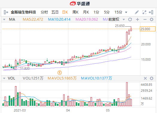 通过华盛通APP可以看到,从5月14日正式公告交易消息到5月18日,仅仅3个交易日金斯瑞生物科技就一度暴涨超过30%。