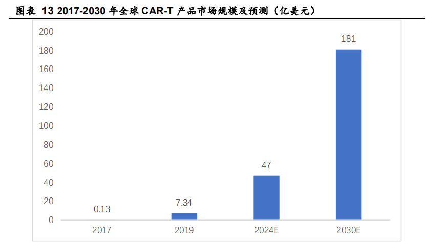 据市场调查数据显示,全球CAR-T市场由2017年的约1300万美元增至2019年的约7.34亿美元,预期于2024年将进一步增长至47亿美元,并于2030年增长至181亿美元。
