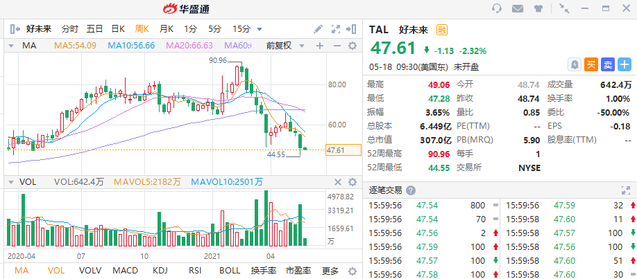而观察民营教育培训巨头好未来的股价走势可谓回撤巨大,从2021年2月中旬的90.96美元一路跌至近期47.6美元水平,2个月时间股价回撤近50%幅度。