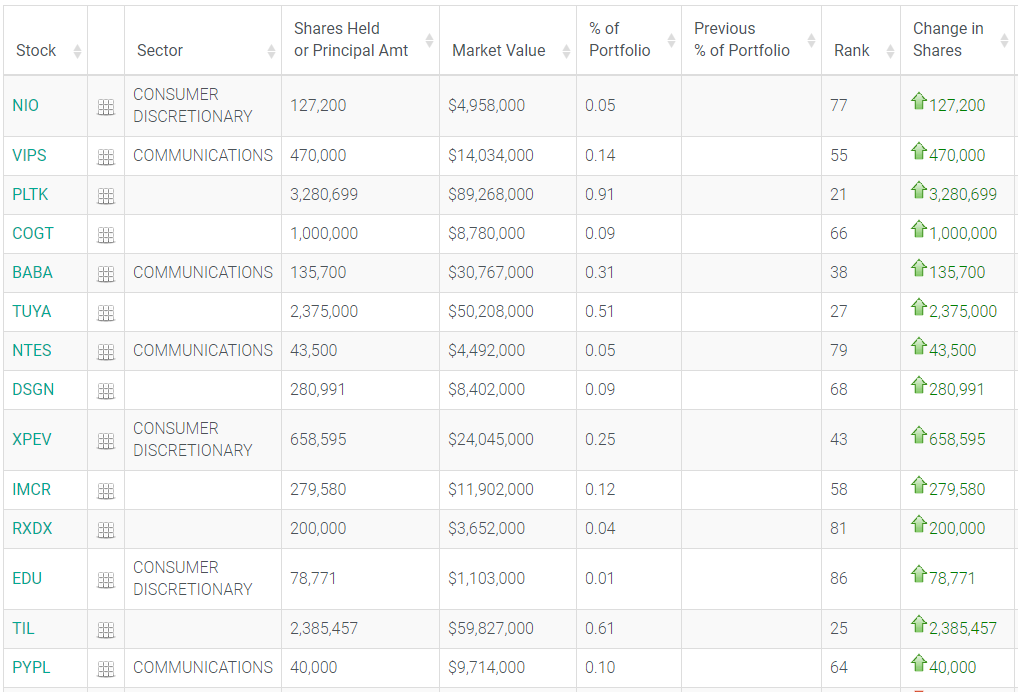 例如国内的电商巨头拼多多和京东,高瓴资本就分别持有了13.7亿美元和3.51亿美元市值,不过高瓴对于京东进行了大幅减仓的操作,持仓股数从1358万股降至416.2万股。