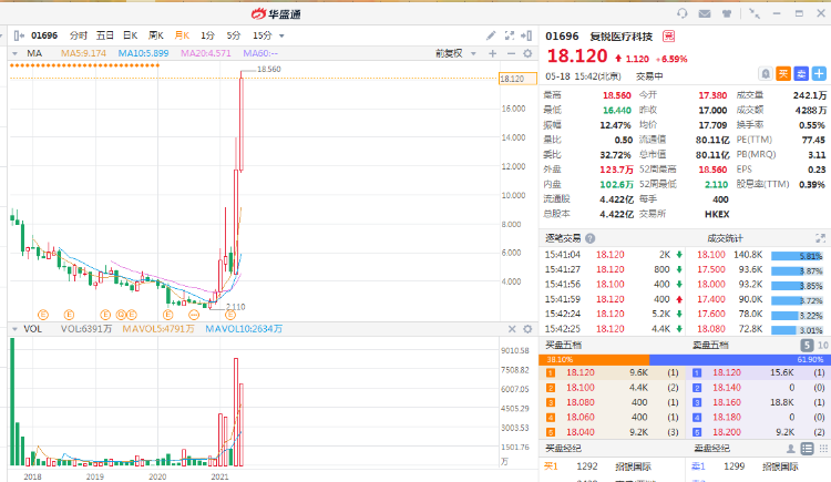 医美设备股复锐医疗科技(1696.HK)继续拉升,现涨6.59%,盘中高见18.12港元,再创历史新高价,总市值超80亿港元。该股今年迄今持续拉升上扬,累计涨幅446%,近一年股价大涨6.4倍。