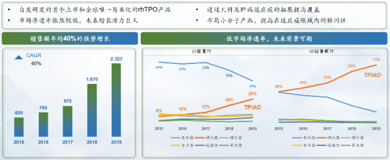 公司核心治疗领域涵盖了肿瘤、免疫、肾科、代谢和皮肤病,公司核心产品(品牌)包括特比澳、益赛普、益比奥和赛博尔等。其中特比澳是公司自主研发的全球唯一商业化的重组人血小板生成素(rhTPO)产品,截止2020年在中国内地血小板减少症治疗市场份额高达73%。