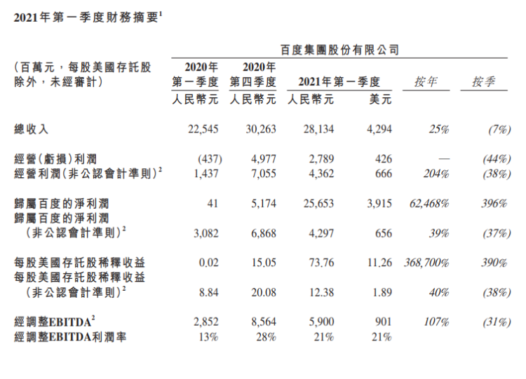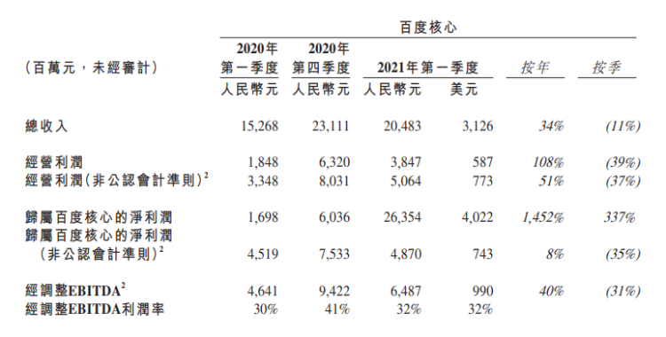 一季度,百度核心收入为人民币205亿元(31.3亿美元),同比增长34%。在线营销收入为人民币 163亿元(24.8亿美元),同比增长27%。非营销收入为人民币42亿元(6.46亿美元), 同比增长70%,主要受云服务等推动。