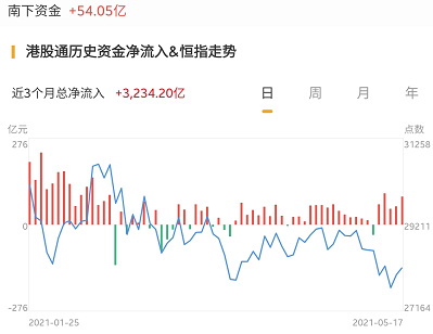 南下资金今日净流入港股高达54.05亿港元,而昨日为净流入超88亿港元。