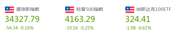 美股全线收低,截至收盘,道指下跌54.34点,跌幅0.16%,报34327.79点;纳指跌50.93点,跌幅0.38%,报13379.05点;标普500指数跌10.56点,跌幅0.25%,报4163.29点。