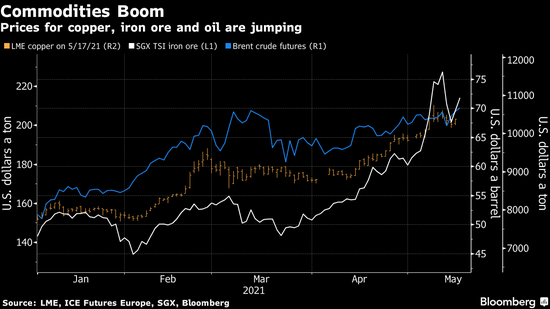 伴随着全球经济复苏以及需求释放,从铜,铁矿石、到石油,2021年各类原材料价格呈现普涨之势。追踪广泛原材料篮子的彭博大宗商品现货指数自1月以来累计上涨21%,有望创下2016年以来最大年涨幅。