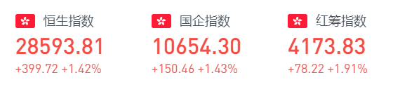 周二,恒生指数开盘涨0.87%,盘初快速拉升逾400点,此后维持窄幅震荡。截至收盘,恒生指数涨399.72点或1.42%,报28593.81点,全日成交额达1305.35亿。国企指数涨1.43%,报10654.3点,红筹指数涨1.91%,报4173.83点。