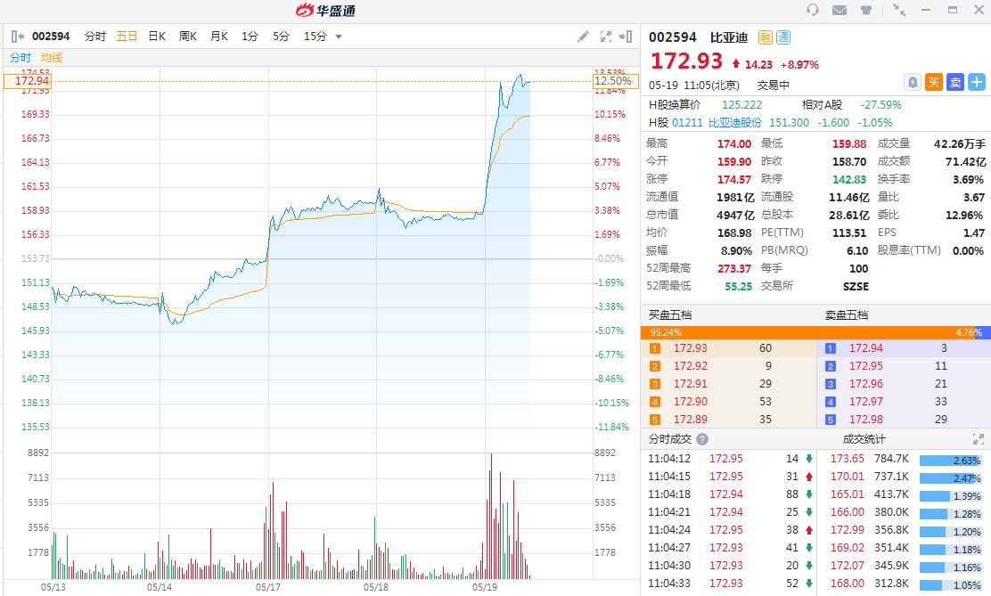 华盛资讯5月19日消息,华为计划 7 月底前在 200 家体验店卖车,年底拓展到1000家以上,余承东在公司内部定下了明年销售30 万台的目标。后续将与华为合作卖车的车企还包括比亚迪、北汽、奔驰和长安等。受此消息影响,截至发稿,比亚迪在A股大涨近9%,现报172.93元每股,总市值4947亿元。