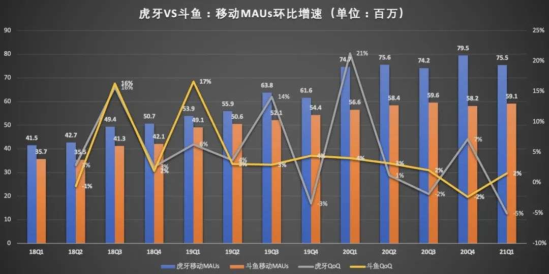 2021年第一季度,虎牙直播移动端MAU(月均活跃用户数)达7550万,较上年同期的7470万,净增80万,比上一季度的7950万减少了400万;斗鱼平均移动MAU从2020年同期的5660万净增250万至5910万,较上一季度的5820万,净增90万。