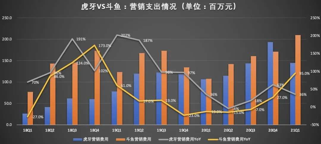 财报数据显示,2021年一季度,斗鱼的营销费用为2.099亿元,较上年同期的1.074亿元,增长了95.4%。