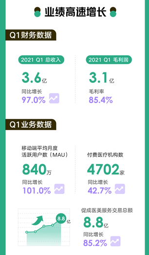 财报数据显示,2021年第一季度,新氧科技总收入3.596亿元人民币(5,490万美元),超过上季度业绩指引,同比大增97.0%。毛利率85.4%,在去年同期76.4%的基础上实现显著增长。移动端平均月活跃用户840万,同比增长101.0%。付费医疗机构数4,702家,同比增长42.7%。付费用户数17.3万人,同比增长123.3%。