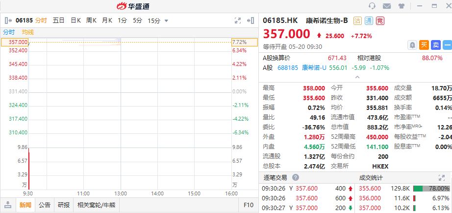 华盛资讯5月20日消息,据媒体报道称,康希诺生物生产的重组新冠病毒疫苗(5型腺病毒载体)(Ad5-nCoV)已在上海开打。记者从康希诺处获悉,除上海外,该疫苗也已在北京、天津、浙江、河南、安徽等多地开打。受消息提振,截止发稿,康希诺早盘涨超7%,现报每股357港元,总市值883.2亿港元,成交额6655万港元。