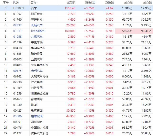 华盛资讯5月20日消息,港股汽车板块今日普涨,截止发稿,浙江世宝涨超9%;英恒科技涨超8%;长城汽车涨超6%;比亚迪股份涨超5%;北京汽车、中集车辆涨超4%;雅迪控股、吉利汽车涨超3%。