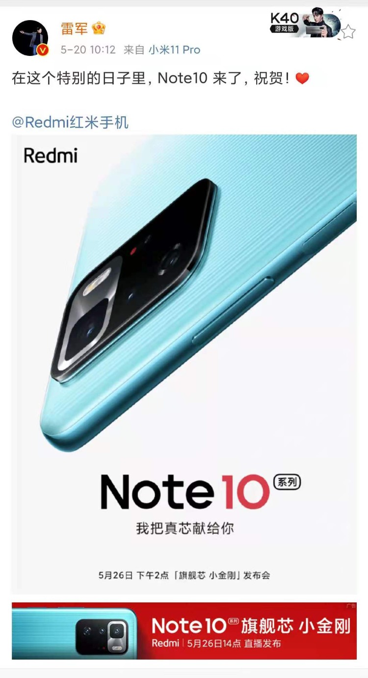 小米创办人,董事长兼CEO雷军5月20上午通过个人微博发文称,在这个特别的日子里,Note 10来了。据悉,Redmi Note10将于5月26日14:00发布。