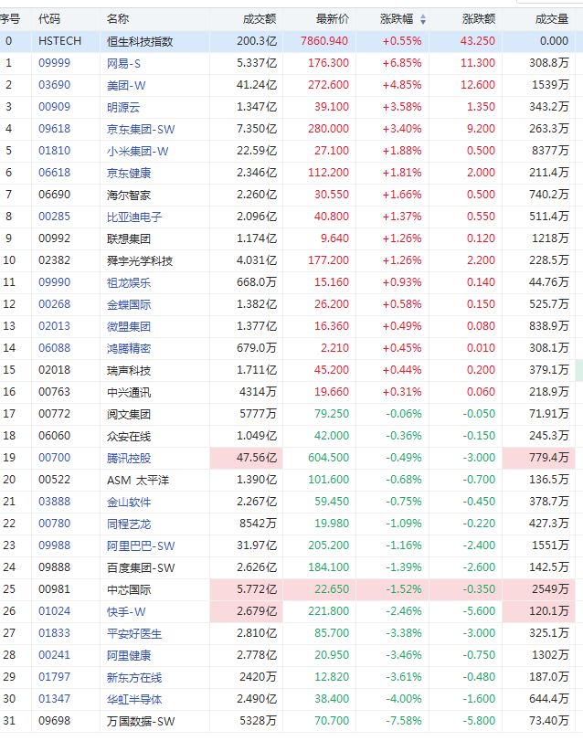 网易-S涨6%;美团-W涨超4%;明源云、京东集团-SW涨超3%;小米集团-W、比亚迪电子涨超1%。