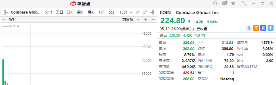 受此影响,加密货币交易所Coinbase开盘下跌12%至210.28美元,创历史新低,截至收盘,该股收跌近6%,报价224.8美元。