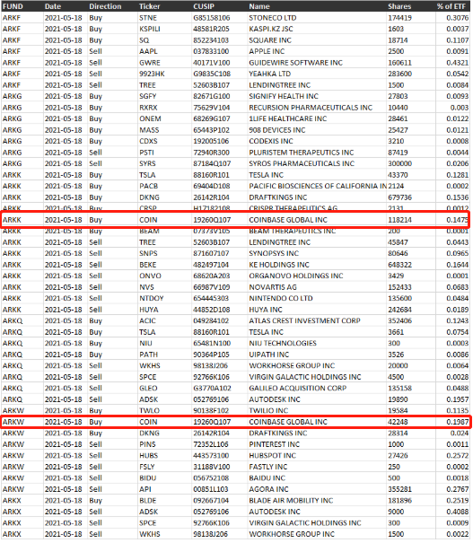 无惧加密货币市场波动,“女股神”Cathie Wood也连续两日加仓Coinbase,ARK旗下的ETF ARKK在周二新买进11.82万股、ARKW则买了4.22万股。昨日Coinbase跌破发行价,而ARKK也再抄底买进13万股、ARKW买进3.53万股。