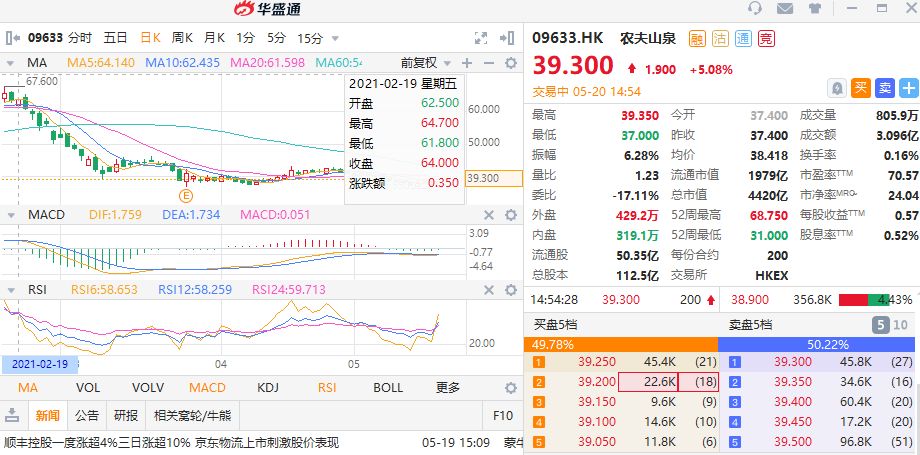 华盛资讯5月20日消息,农夫山泉午后涨超5%,现报每股39.300港元,总市值4420亿港元,成交额3.096亿港元,换手率0.16%。