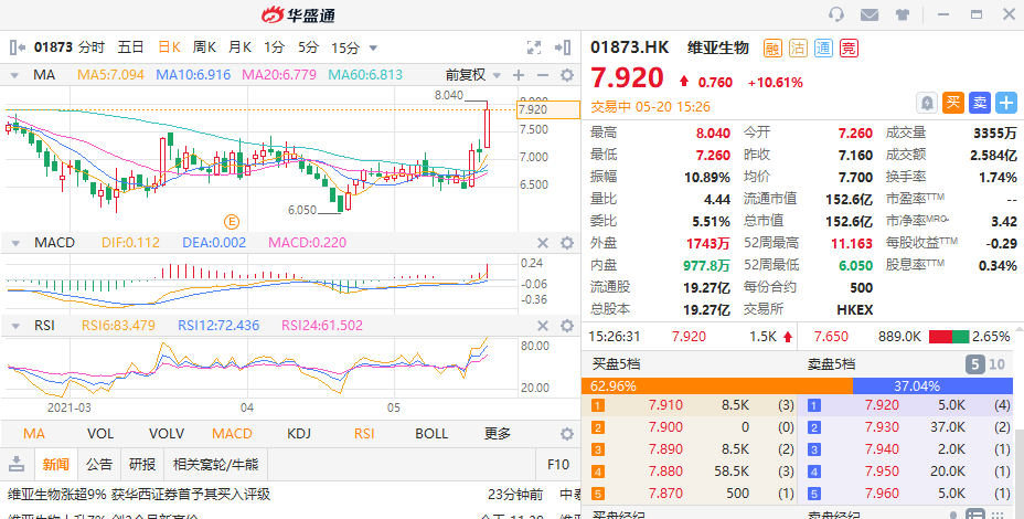 华盛资讯5月20日消息,维亚生物涨超10%。截止发稿,报每股7.920港元,总市值152.6亿港元,成交额2.584亿港元。