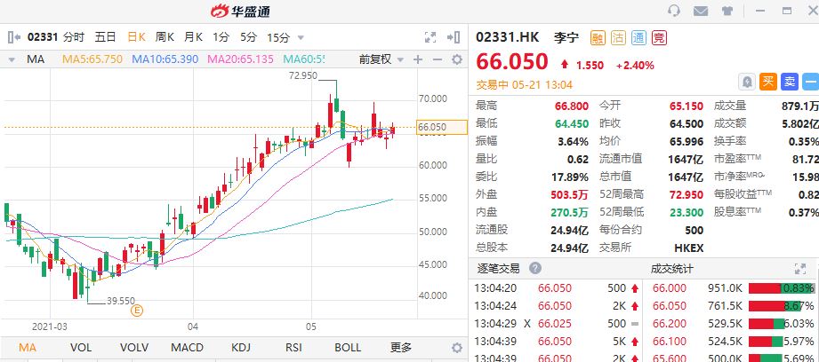 - 汇丰研究曾发研报指,将李宁2021至2023年度的净利润预测分别提高16%、21%、24%,收入预测分别提高16%、19%、23%,维持“买入”评级,目标价由58.9港元上调至71.6港元。