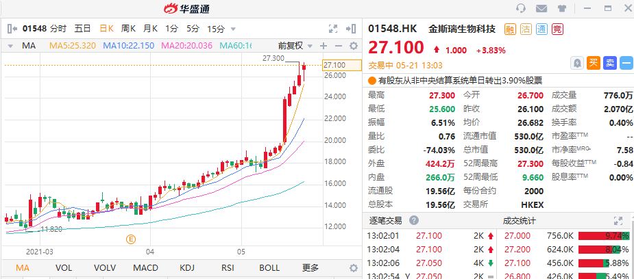 - 摩根大通研究报告中称,公司5月14日宣布获高瓴资本战略入股,预计可改善投资者情绪,显著消除投资者对公司近期的担忧。该行表示,将调整对公司的估值模型以反映近期转变。去年度业绩超预期,以及来自高瓴资本战略投资的利好消息都使公司前景改观。重申金斯瑞生物科技“增持”评级,目标价由23港元上调30.4%至30港元。