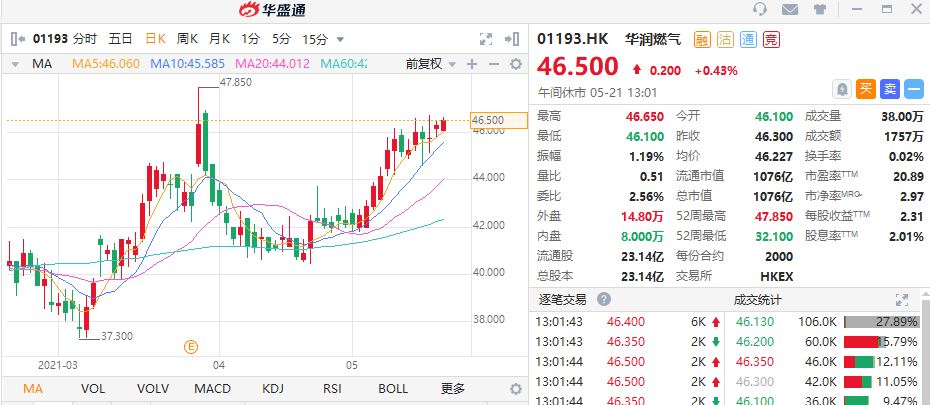 - 中金预计华润燃气1-4月份累计气量同比增速35%,相比1-3月份的累积40%稍微放缓,但是仍然保持在较高的增速区间。预计公司全年气量增速在20%以上,超出管理层的指引。中金认为,公司在南方暖居业务上的先发优势较为明显,即未来的暖居潜在市场与现有的燃气特许经营权范围高度重合,升华润燃气目标价11%至50港元,维持“跑赢行业”评级。