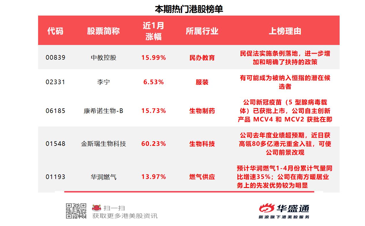 本周的港股风向标又和大家见面了,近期民促法实施条例靴子落地,受消息提振,职高教个股频受资金关注;本周五盘后,恒生指数公司将公布恒生系列指数一季度审议结果,大批行业龙头有望被纳入;高瓴资本超80亿港元的重仓杀入,使金斯瑞生物科技持续拉升;疫苗板块也持续在市场活跃。