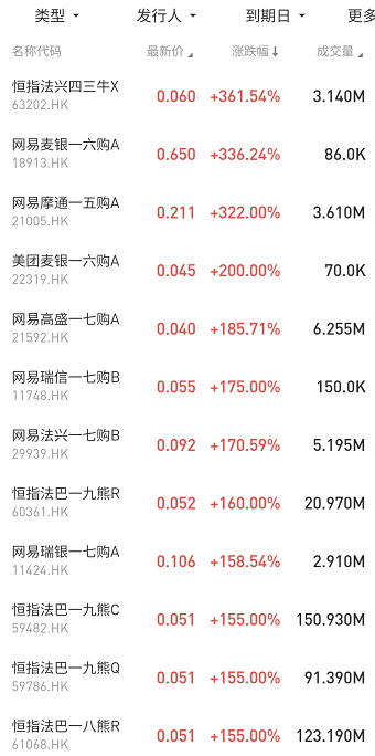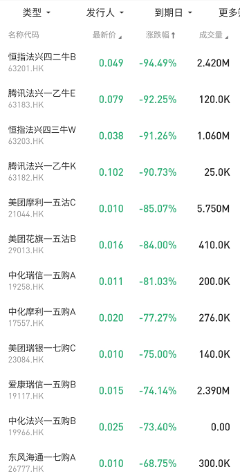 在今日跌幅榜中,恒指法兴四二牛B跌94.49%;腾讯法兴一乙牛E跌92.25%。