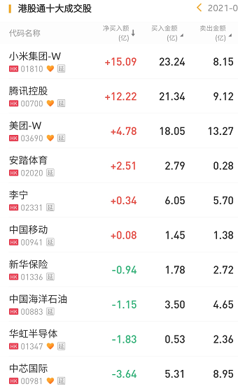 个股方面,今日南下资金净买入小米集团15.09亿港元,为今日买入之最。此外,南下资金净买入腾讯控股12.22亿港元,净买入美团4.78亿港元。